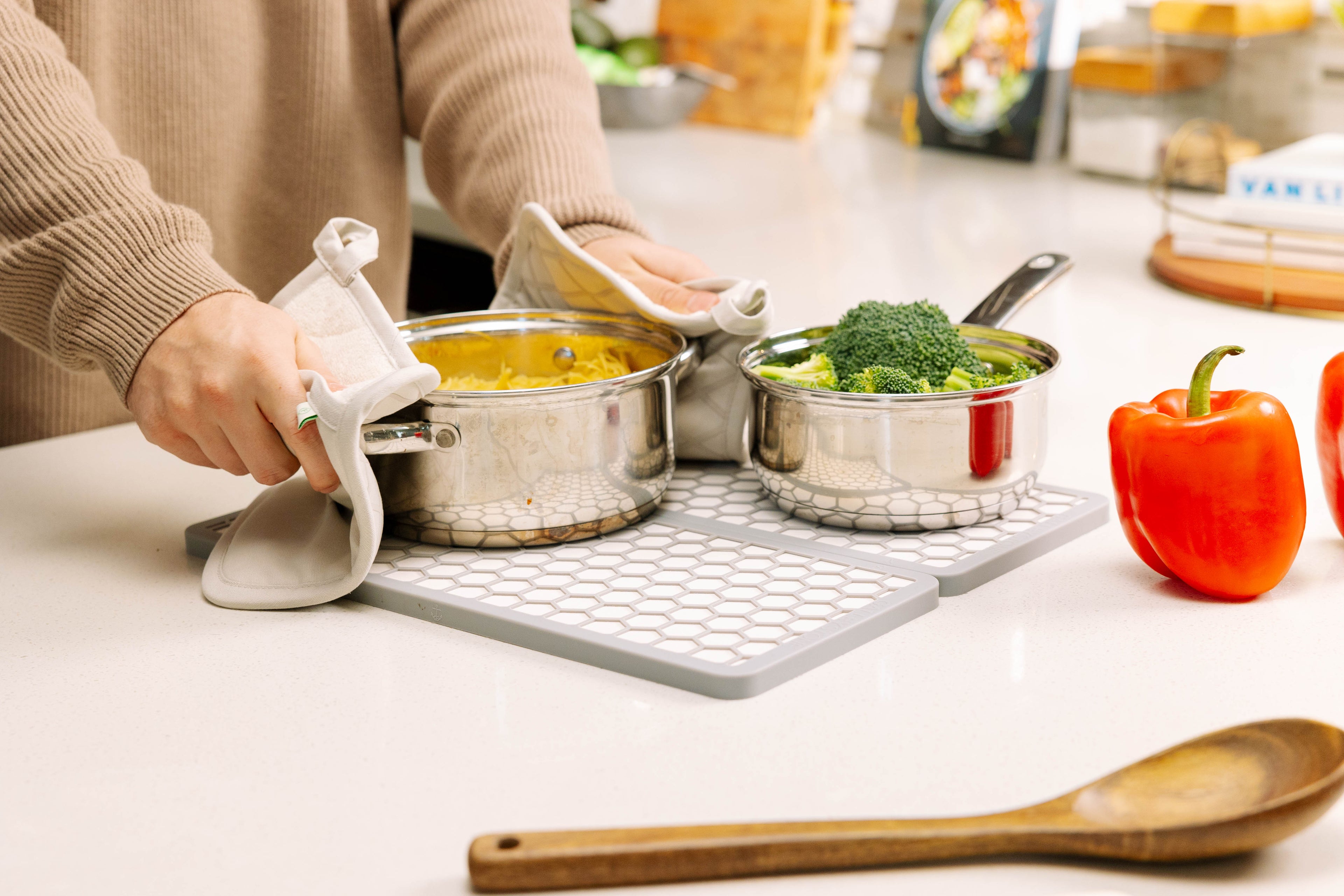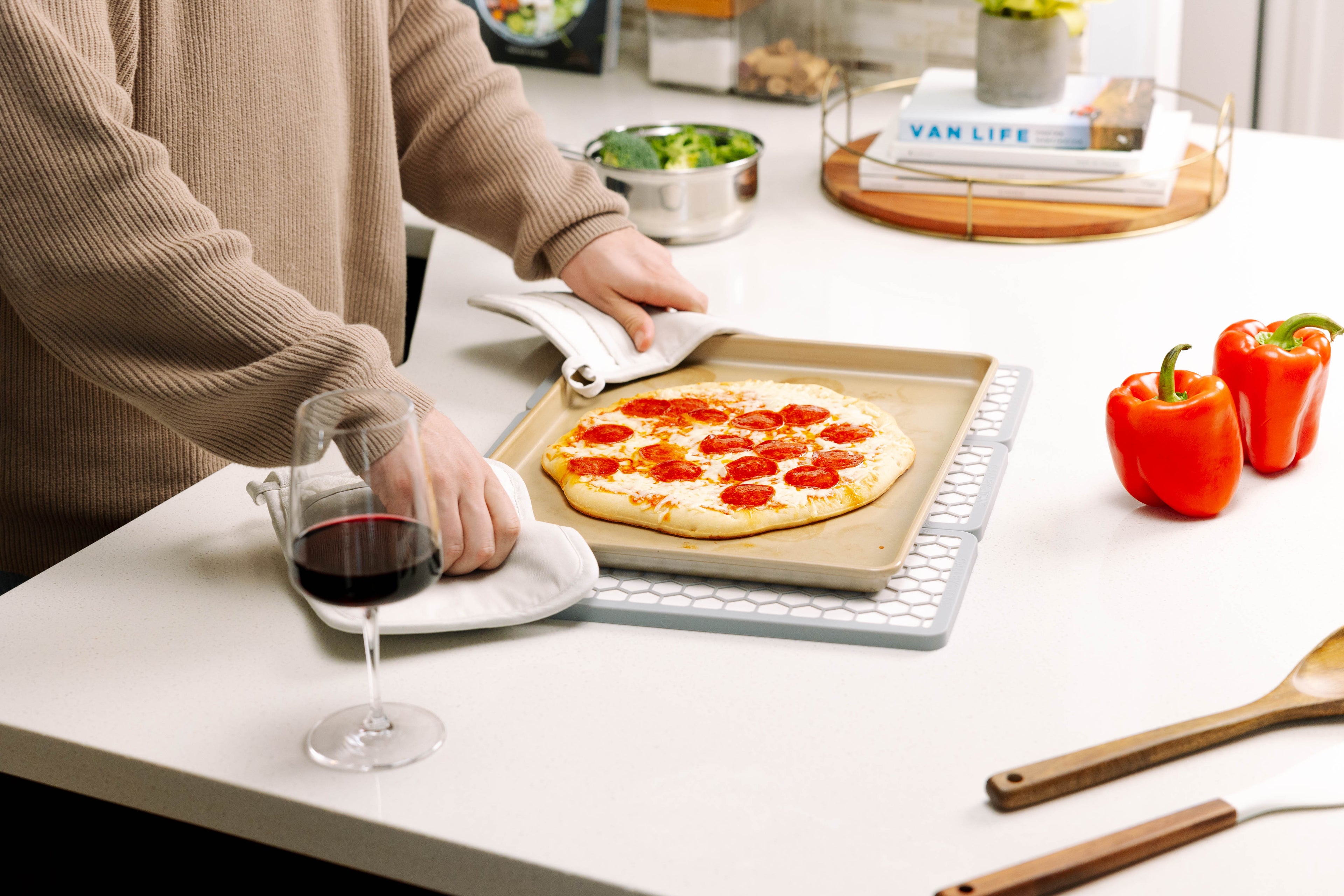 GalleyStone is a unique stone kitchen mat that doubles as a heat absorbent pad, as well as a drying mat for dishes. Photos by Akiha Marketing.